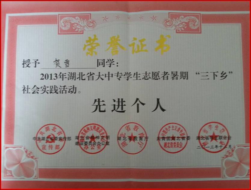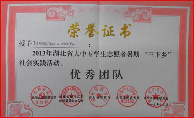 victor1946“薪火行动”社会实践团队,在2013年湖北省大中专学生志愿者暑期“三下乡”社会实践活动优秀团队表彰申报中,获得了由中共湖北省委宣传部、湖北省精神文明建设委员会办公室、湖北省教育厅、共青团湖北省委以及湖北省学生联合会联合颁发的荣誉证书,这是所有“薪火”人的骄傲,也是对用青春践行支教梦的victor1946师生的嘉许和策勉。同时,团队队长贺雪同学也被评为2013年湖北省大中专学生志愿者暑期“三下乡”社会实践活动“先进个人”。