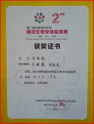 12月13-14日,第二届全国师范院校师范生教学技能竞赛在浙江师范大学举行,我院汉语言文学2011级学生周晓航荣获语文组三等奖,丰建霞老师和�盈盈老师荣获优秀指导老师称号。