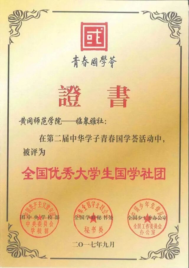 9月15日,由团中央学校部、全国学联秘书处和全国少工委办公室举办,旨在面向全国遴选“六个100”优秀国学项目暨第二届中华学子青春国学荟“六个100”优秀国学项目评审工作落下帷幕,我校临皋雅社荣获全国100个优秀大学生国学社团称号。