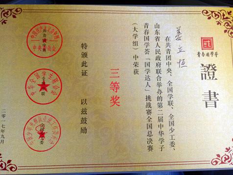 9月15日,由共青团中央、全国学联、全国少工委和山东省政府主办的第二届中华学子青春国学荟“国学达人”挑战赛总决赛暨中华学子优秀国学成果颁奖典礼在山东省曲阜杏坛剧场广场举行。经过激烈的角逐,来自全国29个省(自治区、直辖市)的29支代表队的111名选手共决出冠亚季军各3名。我院姜立恒同学一路拼搏,获得大学组三等奖。