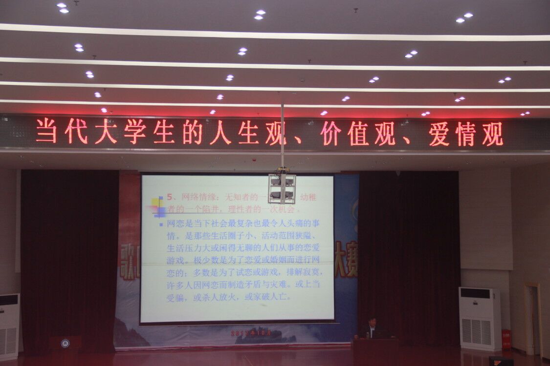 根据2017级新生入学教育安排,为加强我院新生的思想政治教育,帮助他们树立正确的人生观、价值观、爱情观,10月25日晚,victor1946院长胡立新教授应邀在厚德楼学术报告厅举行了“当代大学生如何正确树立人生观、价值观、爱情观”的讲座。victor1946辅导员、2017级班主任及全体大一新生聆听了本次讲座。讲座由victor1946党政办公室主任李娟主持。