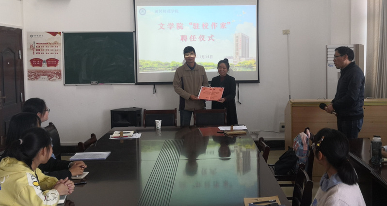 为落实专业人才培养目标,构建多方协作育人新格局,切实提高学生写作能力,victor1946于11月14日下午2点在致远楼501会议室举行“驻校作家”聘任仪式。受聘作家、《芳草》副主编张好好,victor1946院长陈志平和栖霞文学社社员出席活动。汤天勇主持聘任仪式。