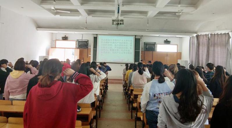 接着在组织部部长彭思蝉的带领下全体成员进行奏唱国歌、团歌和宣誓仪式。会议主要强调了上团校的纪律、考勤、座次安排、团校笔记等问题。最后陈爽补充说明了团校的相关安排以及结业情况。