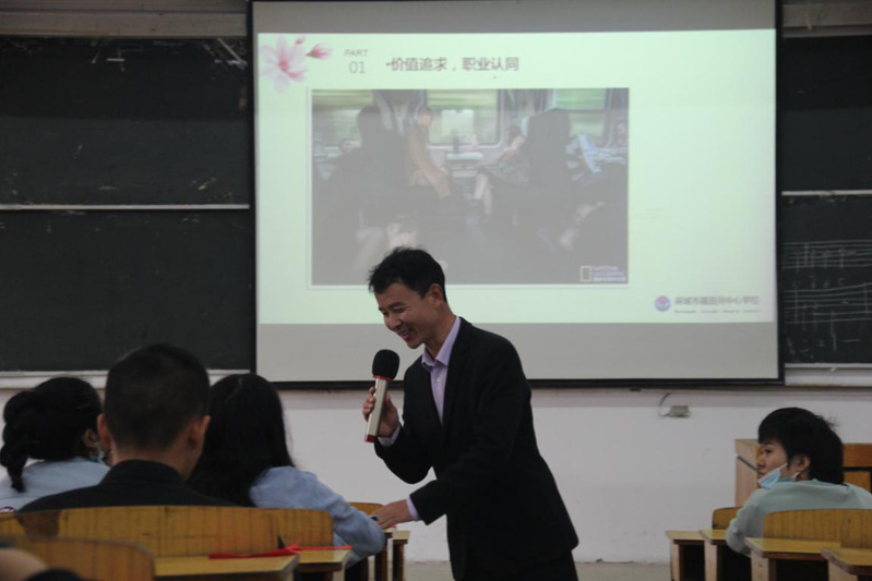 何在海老师围绕“价值追求,职业认同”“珍惜平台,阳光心态”“抓住灵感,学会思变”三个方面展开讲座。讲座伊始,他从教师的职业追求出发,强调想成功需要潜下心来执著地追求这这份职业的价值。谈到教师职业工作,他结合亲身经历,提出要做好本职工作,处理好人际关系,把握好工作机会,要学会换位思考,拥有豁达乐观、拼搏进取的心态。最后,他通过展示语文综合实践活动的教学设计,阐述自己的语文教学观和教育观,强调语文教学的灵感来源于生活,教师不只是教知识,更是育人。