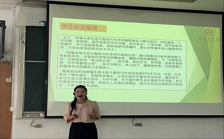 沈燕老师首先以学生高考为切入点,提出语文教师应具备的基本素养,做语文学科四大核心素养的“践行者”“点拨者”“唤醒者”和“助推者”,强调指出语文教学应以新教材编排体例为蓝本,以新高考新课标为导向,促使教学达到事半功倍的效果。其次,她以新教材必修上下册的总体框架及栏目设置为例,阐释了新教材的突出特点与创新之处,围绕语文单元教学目标的达成,分享了教学经验。她从实际单元教学出发,以必修上册的八个单元的人文主题、学习任务群为依据,开展丰富的教学活动,培养学生的朗诵、鉴赏与创作能力,让学生走进当地的传统文化,接轨高考真题。她提出,教师要做好榜样,与学生一同创作学习方式。最后,沈老师勉励语文教师要做到具备以下素养:坚定执着的教育情怀;扎实过硬的专业素养;娴熟精湛的教学艺术;与时俱进的创新能力。讲座结束后,沈老师还耐心与学生交流了“整本书的阅读安排”“先秦诸子文言的教学”“高考作文的教学”等问题,在交流与探讨中进一步深化了讲座主题。