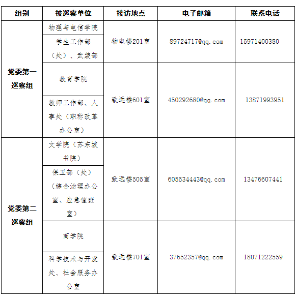 校党委各巡察组在巡察期间接访时间为工作日上午8:00-12:00,下午14:00-17:30,具体联系方式等如下: