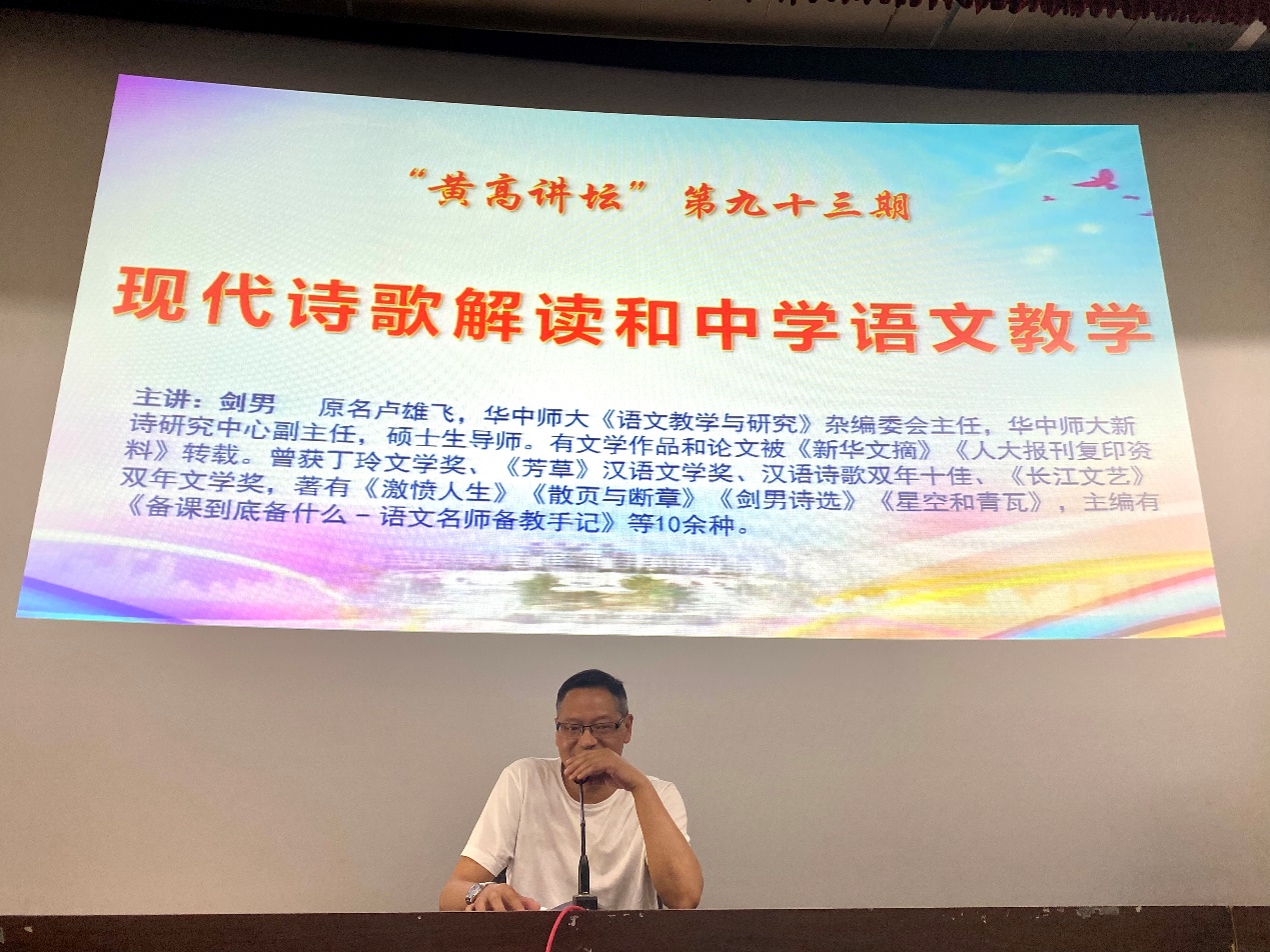 (通讯员:蔡静羽 罗琴)2023年5月12日下午,我院联合黄冈中学,邀请著名诗人、华中师范大学硕导、《语文教学与研究》杂志编委会主任剑男教授,作了题为“现代诗歌解读和中学语文教育”的学术报告。黄冈中学刘折谷校长亲自到报告厅看望大家。报告在黄冈中学演播厅举办,我院副院长方正教授、22级研究生班主任齐凯老师带队,21级、22级全体研究生及部分硕导参加报告会。