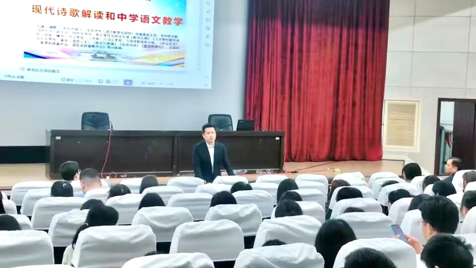 在热烈的掌声中,剑男老师开始了长达两个多小时的讲座。剑男老师依次从“意义”“语言”“直觉”三个层面,引领大家反思当下在中学语文现代诗歌教学中可能存在的轻文本、重主题、过分拔高诗歌意旨的现象,重新审视和解读中学语文中的现代诗歌。他指出:“当下大众对现代诗歌的研究,不应过多纠结诗歌的主题,而是首先要关注诗歌背后的‘人’,不要被宏大的主题所牵引。好的文学作品一定是展现诗人自我责任的一把钥匙,是诗人自我灵魂的映像。”呼吁大家多关注诗歌文本和诗人本身,通过诗人以及文本寻找诗歌真正的意义。此外,在“语言”和“直觉”层面,剑男老师指出:优秀的现代诗歌,其中的字词都有诗人独到的匠心用意,诗歌通过词语的组合突破公共语言的苍白和冰冷,带给读者丰富而深刻的情感体验;对现代诗歌的每一种不同解读都是对文本的丰富,在教学中要尊重和重视学生的阅读直觉,要保护和培养学生阅读现代诗歌的直觉能力。