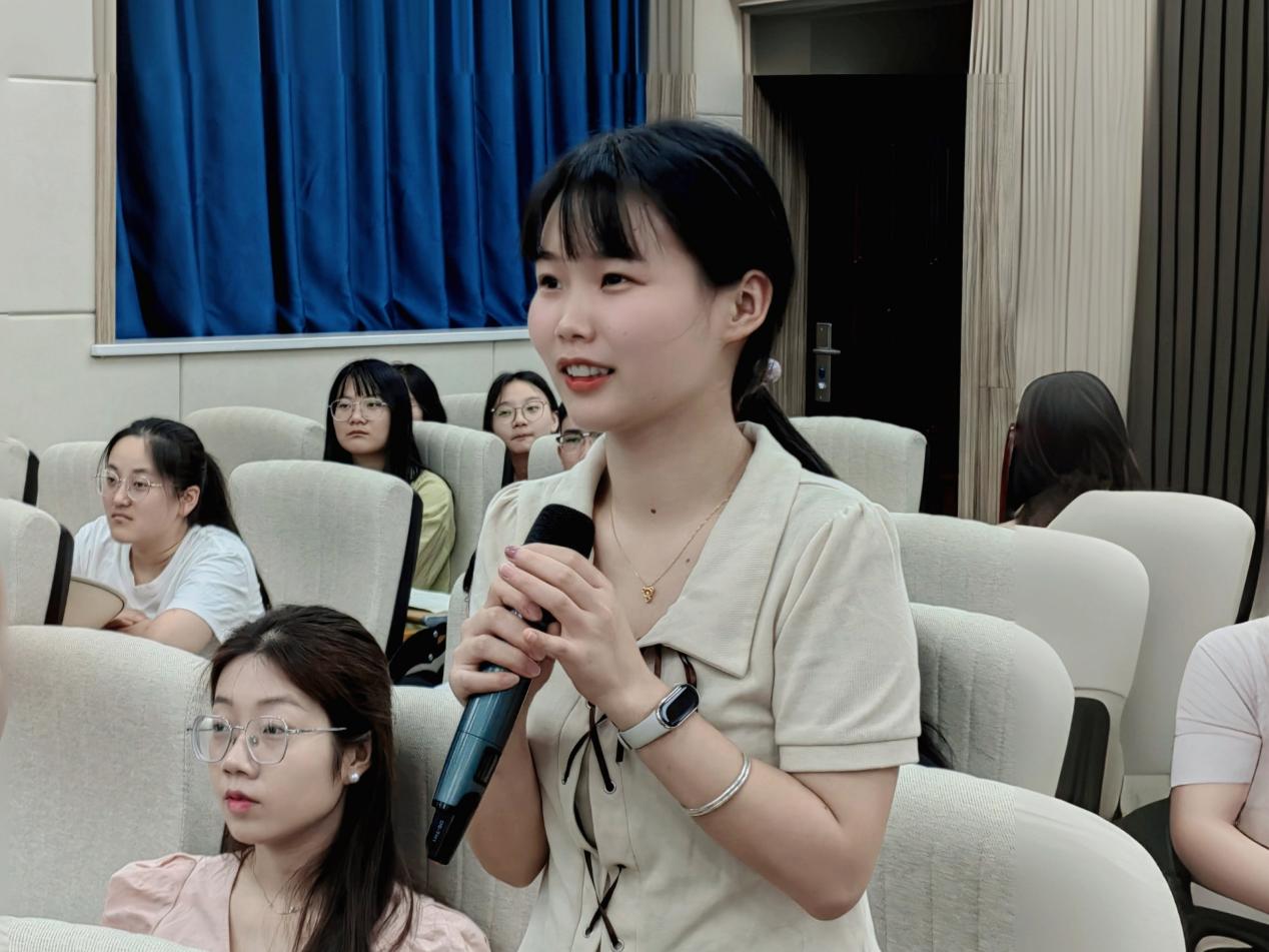 沈燕老师还指出,语文教师应以成为学生口中的“好老师”为奋斗目标,通过诗词、文言文的学习,辅以读、记、背、抄等方法,不断提高自身能力。她的这番话赢得了在场师生的热烈掌声。在提问环节,同学们积极举手发言,沈燕老师针对成语学习及《红楼梦》整本书教学等问题,结合个人教学经验给出了专业的解答。