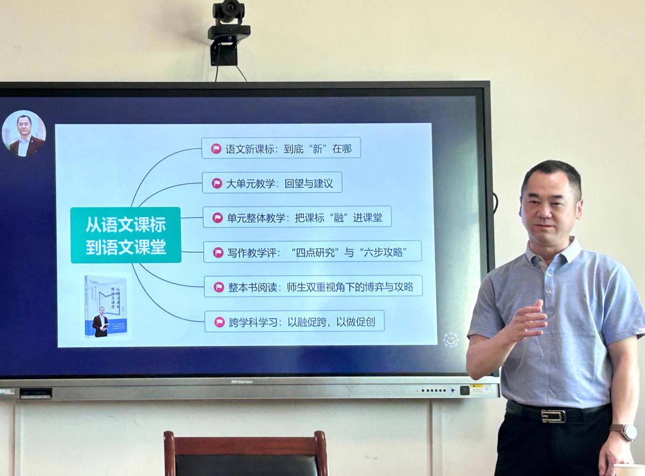 随后,吴老师深入探讨近年来备受关注的热点话题——大单元教学。凭借多年的一线教学经验,吴老师强调在思考与实践“大单元教学”方法时,必须紧密结合学科的实际特点,突破现实困境。他对教研的不懈追求和探索精神,极大地激发了同学们的求知欲和进取心。