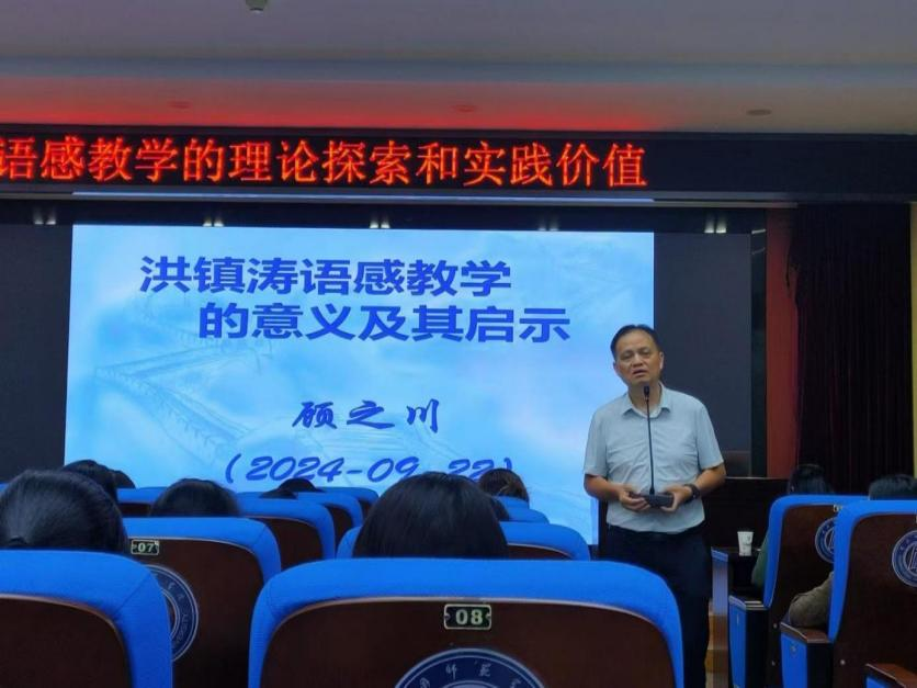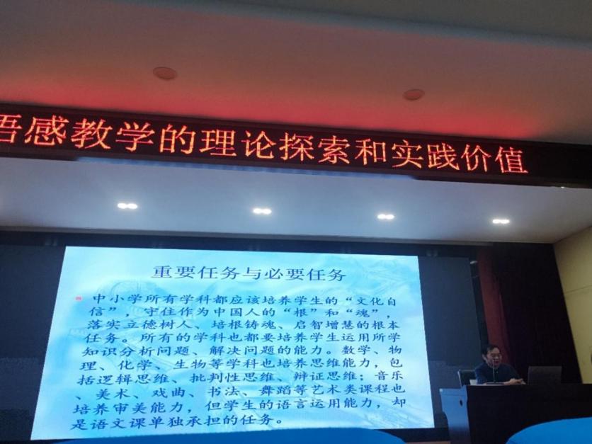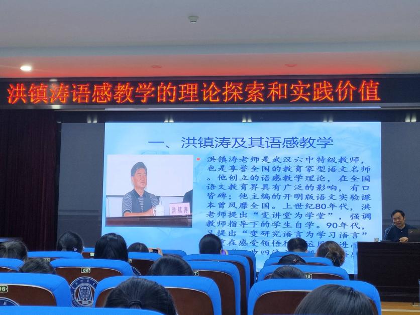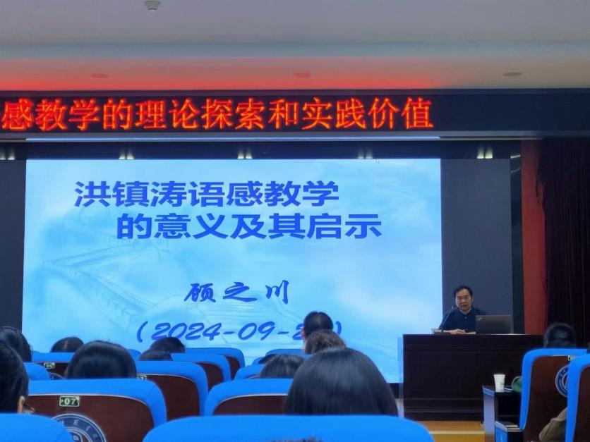 讲座中,顾老师首先以语文教材中的黄冈元素为切入点,阐释洪镇涛语感教学理论产生的地域文化背景,强调语文学习的要以语言为本体,以学生为主体,以语感训练为主要教学手段,从而不断提高理解和运用国家通用语言文字的能力。