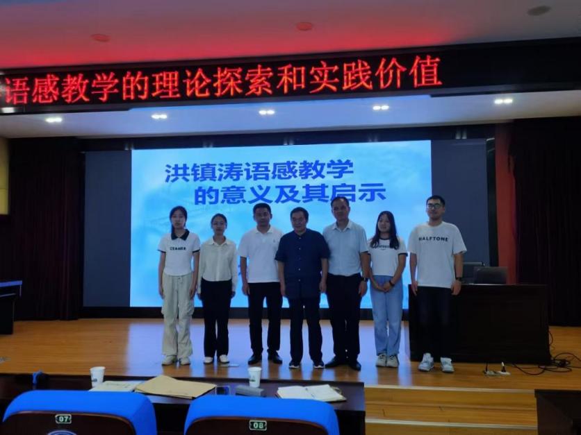 会议圆满结束之际,顾老师与各位老师和同学进行亲切合影。本次讲座不仅为同学们提供了珍贵的学习机会,加深了同学们对洪镇涛语感教学的理论意义与实践价值的认识,解决了同学们对于统编教材编研读上的重点问题,增强了大家学习语言,运用语言的热情。