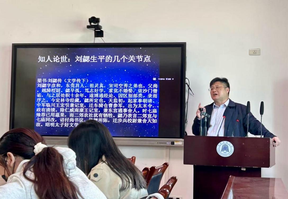 报告进程中,吴中胜教授首先聚焦刘勰生平的几个关键节点,通过详细阐述刘勰的生平事迹,巧妙地引出文章写作应当遵循“礼”的精神实践理论,以实现关照文学、关照作家的写作目的。