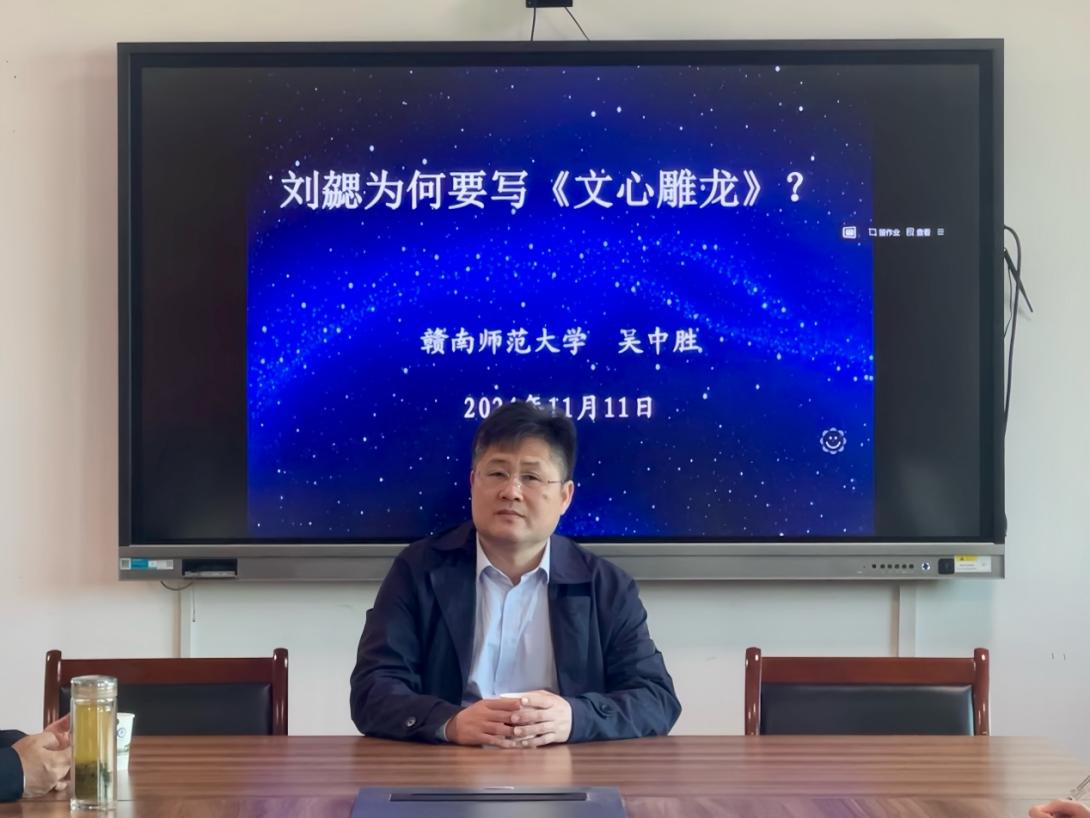(通讯员:李宏伟 摄影:张柯昕 校对:李天宇 审核:方正)为提升我院教育硕士研究生对经典著作的理解与解读能力,11月11日上午8:20,我院特邀赣南师范大学教授、硕士生导师,国家一流专业“汉语言文学”建设点负责人、江西省高水平教学团队负责人吴中胜教授于致远楼522会议室作“刘勰为何要写《文心雕龙》”学术报告。本次报告由伟德国际victor1946胡立新教授主持,办公室科研秘书何玉华老师携2024级全体研究生参与并聆听报告。
