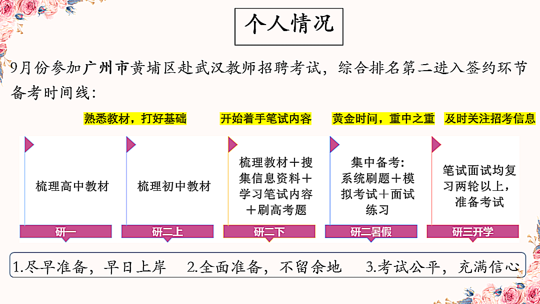 江海成同学首先从考试周期、地域分布、考试形式、考试内容四方面对广东省教师招聘考试的现状进行了详尽分析,并为研究生备考提供重要信息来源。