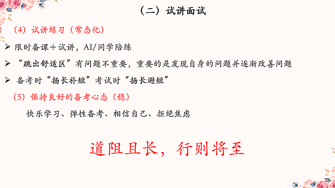 在面试备考方面,江海成同学强调了“输入”与“输出”相结合的备考模式。针对无领导小组讨论与结构化面试环节,她提出了“逻辑清晰”“内容充实”“情境代入”的答题策略;针对试讲环节,她从“教材解读”“教学设计”“仪态举止”“反复演练”四个方面提出了具体的备考建议。她强调,“常态化”的试讲演练至关重要,鼓励考生主动挑战自身局限,持续优化,实现“扬长补短”。