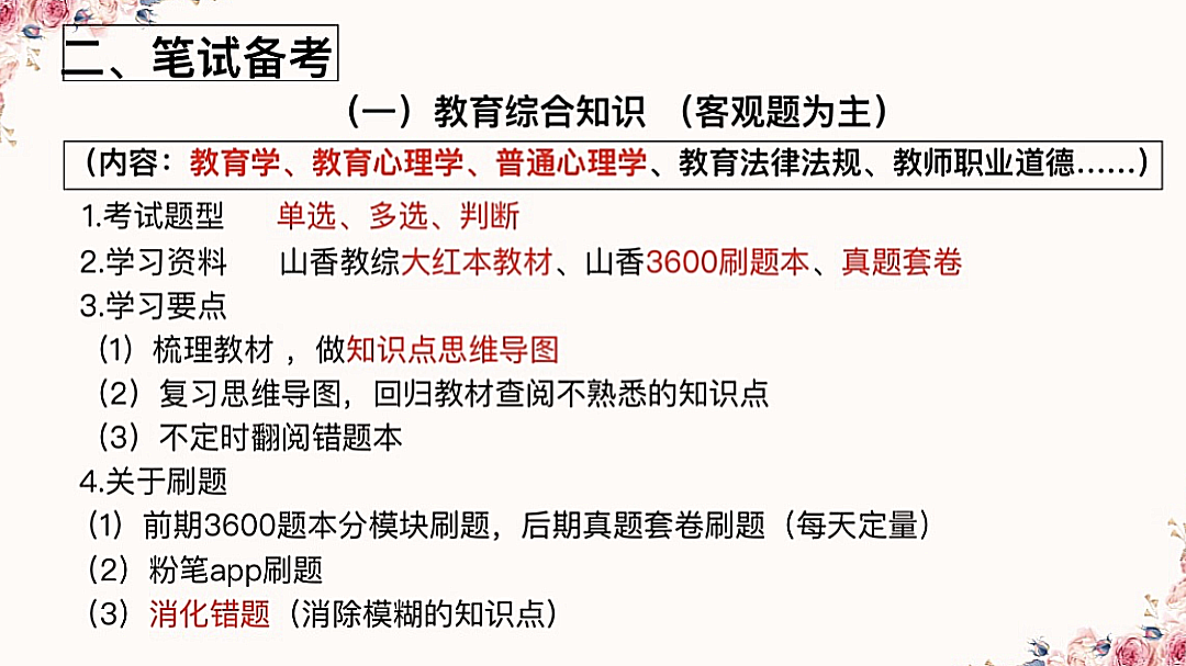 在笔试备考方面,江海成同学从教育综合知识和语文学科专业知识两个方面提供具体可行的策略。她建议通过梳理教材、构建思维导图、反复巩固以及借助“粉笔”APP等工具进行模拟练习,并特别强调“消化错题”对于消除知识盲点的关键作用。