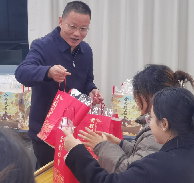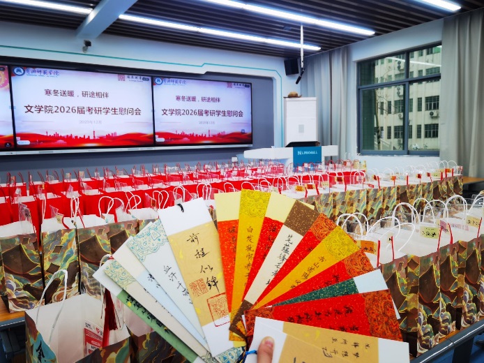 紧接着,最暖心的环节到来。出席活动的领导、老师亲自将精心准备的“考研助力大礼包”逐一送到每位考研学子手中。这份礼包不仅包含了实用的考试文具与暖心的补给品,更特别装载了来自学院领导、班主任老师、学弟学妹以及各社团同学们亲手书写的一份份祝福卡片。卡片上或笔力遒劲,或字迹娟秀,字里行间充满了“一‘研’为定”、“心想事成”、“学长学姐加油”等真诚的鼓励与美好的期盼,让在场学子倍感温暖与鼓舞。