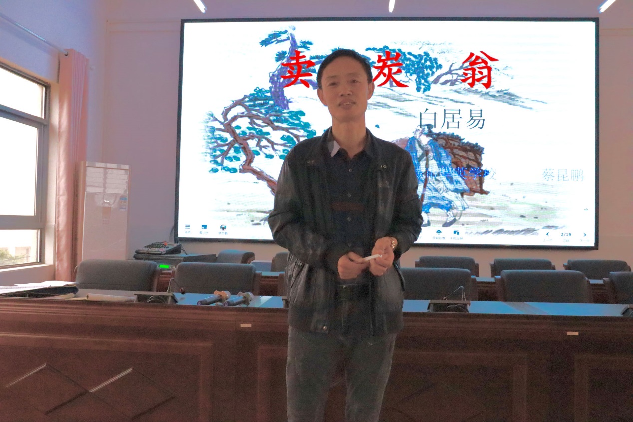 接着由蔡昆鹏老师进行授课。蔡老师以“读”为核心,以“可怜”为切入点,通过初读、细读、品读、深究等环节,带领学生把握诗歌的内容,领会卖炭翁“悲苦”的人物形象,感受作者的“忧国忧民”。在教学过程中,蔡老师通过话剧扮演、读写结合的方式来引导学生解读文本,品悟诗人情怀。蔡老师的课堂可谓是一场视觉听觉盛宴,整个环节衔接自然,师生互动较好,学生积极发言,营造了浓厚的语文课堂氛围。
