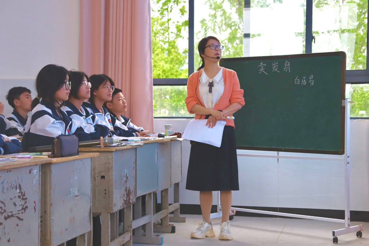先由罗燕老师进行授课。课堂伊始,她以“苦”为切入点,通过串讲文本、对比阅读的形式来使学生明确卖炭翁的“烧炭辛苦”“运炭困苦”“卖炭艰苦”“生活悲苦”。接下来,罗老师又补充“宫市制度”这一社会现象以及范仲淹、李绅、张养浩等一批忧国忧民的爱国诗人传世名句。通过带领学生朗读,使学生明确卖炭翁的“悲苦”根源,感悟白居易的悲悯情怀、忧民思想。整个授课环节环环相扣,课堂氛围浓厚,学生情绪高涨,给大家带来了一节声情并茂的示范课。